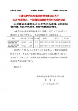 [投资者关系]600887_2025-09-30-伊利股份-内蒙古伊利实业集团股份有限公司关于2025年度第九、十期超短期融资券兑付完成的公告(银创产业通www.chanyetong.net)