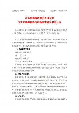 [投资者关系]600276_2025-11-14-恒瑞医药-恒瑞医药关于获得药物临床试验批准通知书的公告(银创产业通www.chanyetong.net)