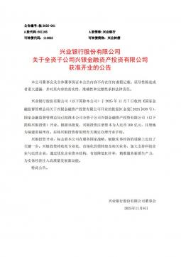 [投资者关系]601166_2025-11-10-兴业银行-兴业银行关于全资子公司兴银金融资产投资有限公司获准开业的公告(银创产业通www.chanyetong.net)