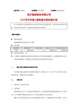 [投资者关系]600690_2025-11-01-海尔智家-海尔智家股份有限公司2025年半年度A股权益分派实施公告(银创产业通www.chanyetong.net)