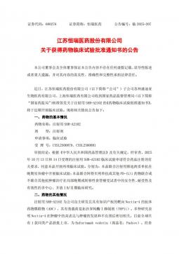 [投资者关系]600276_2025-12-25-恒瑞医药-恒瑞医药关于获得药物临床试验批准通知书的公告(银创产业通www.chanyetong.net)