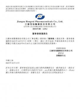 [投资者关系]600276_2025-10-14-恒瑞医药-H股公告-董事会会议通告(银创产业通www.chanyetong.net)