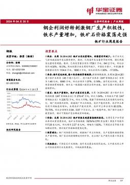 [金属]2024-04-30-华宝证券-铁矿行业周度报告:钢企利润好转刺激钢厂生产积极性,铁水产量增加,铁矿石价格震荡走强-7页(银创产业通www.chanyetong.net)
