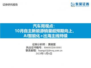 [新能源汽车]2023-11-06-东吴证券-汽车周观点:10月自主新能源销量超预期向上,AI智能化+出海主线持续-30页(银创产业通www.chanyetong.net)(银创产业通www.chanyetong.net)