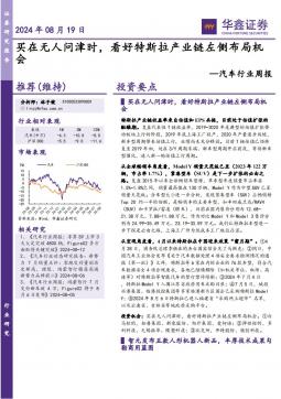 [汽车零部件]2024-08-19-华鑫证券-汽车行业周报:买在无人问津时,看好特斯拉产业链左侧布局机会-15页(银创产业通www.chanyetong.net)(银创产业通www.chanyetong.net)