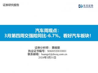 [汽车零部件]2024-04-01-东吴证券-汽车周观点:3月第四周交强险同比-6.7%。看好汽车板块!-29页(银创产业通www.chanyetong.net)