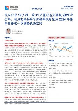 [汽车整车]2023-12-28-联储证券-汽车行业12月报:前11月累计总产销超2022年全年,动力电池各环节价格降低有望为2024年整车价格进一步调整提供空间-21页(银创产业通www.chanyetong.net)(银创产业通www.chanyetong.net)