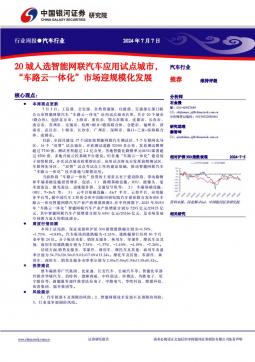 [无人驾驶]2024-07-09-中国银河-汽车行业行业周报:20城入选智能网联汽车应用试点城市,“车路云一体化”市场迎规模化发展-20页(银创产业通www.chanyetong.net)(银创产业通www.chanyetong.net)