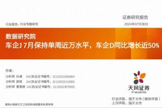 [汽车零部件]2024-07-30-天风证券-汽车行业专题研究:数据研究院-车企J7月保持单周近万水平,车企D同比增长近50%-11页(银创产业通www.chanyetong.net)