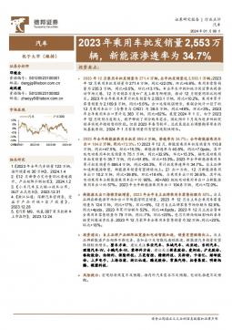 [新能源汽车]2024-01-10-德邦证券-汽车:2023年乘用车批发销量2,553万辆,新能源渗透率为34.7%-2页(银创产业通www.chanyetong.net)