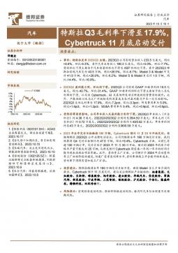 [汽车零部件]2023-10-19-德邦证券-汽车行业点评:特斯拉Q3毛利率下滑至17.9%,Cybertruck 11月底启动交付-2页(银创产业通www.chanyetong.net)