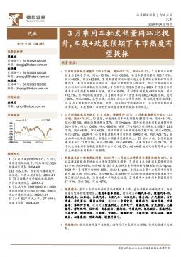 [汽车零部件]2024-04-10-德邦证券-汽车行业点评:3月乘用车批发销量同环比提升,车展+政策预期下车市热度有望提振-2页(银创产业通www.chanyetong.net)(银创产业通www.chanyetong.net)