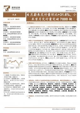 [汽车零部件]2024-05-06-德邦证券-汽车行业点评:4月蔚来交付量环比+31.6%,小米首月交付量突破7000辆-2页(银创产业通www.chanyetong.net)