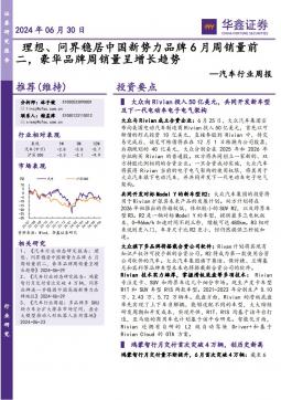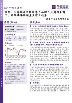 [汽车零部件]2024-06-30-华鑫证券-汽车行业动态研究报告:理想、问界稳居中国新势力品牌6月周销量前二,豪华品牌周销量呈增长趋势-5页(银创产业通www.chanyetong.net)(银创产业通www.chanyetong.net)