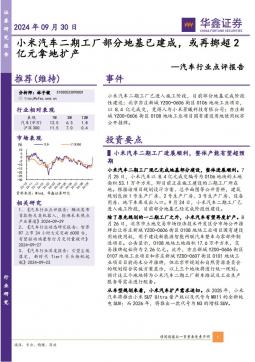 [汽车零部件]2024-09-30-华鑫证券-汽车行业点评报告:小米汽车二期工厂部分地基已建成,或再掷超2亿元拿地扩产-4页(银创产业通www.chanyetong.net)(银创产业通www.chanyetong.net)